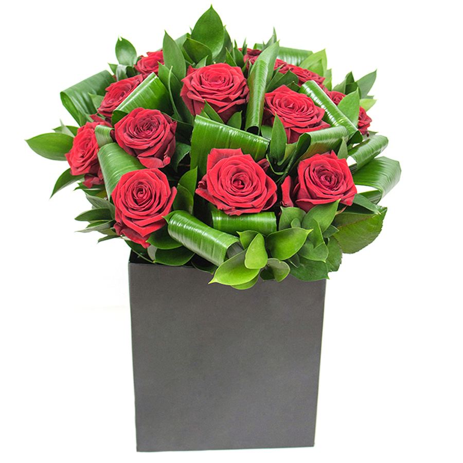 Experience the timeless beauty of our stunning bouquet, meticulously crafted with vibrant red roses, lush aspidistra leaves, and delicate ruscus. Each arrangement is a unique masterpiece, designed to add style and elegance to any space.