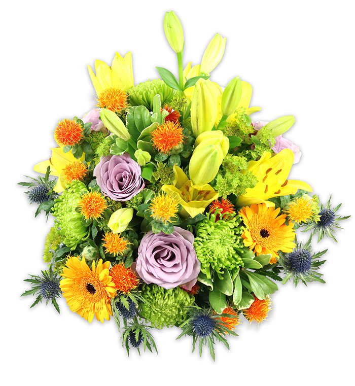 Step into a world of floral artistry with our exclusive bouquet crafted to brighten your day. Showcasing an enchanting blend of yellow, orange, green, and subtle blue accents, this arrangement bursts with life. Each bloom is meticulously hand-picked to ensure exceptional freshness and longevity. Delivered as budding flowers, enjoy the magical transformation as your bouquet unfolds into a captivating spectacle.