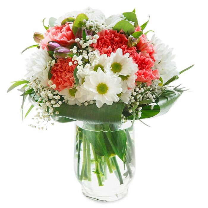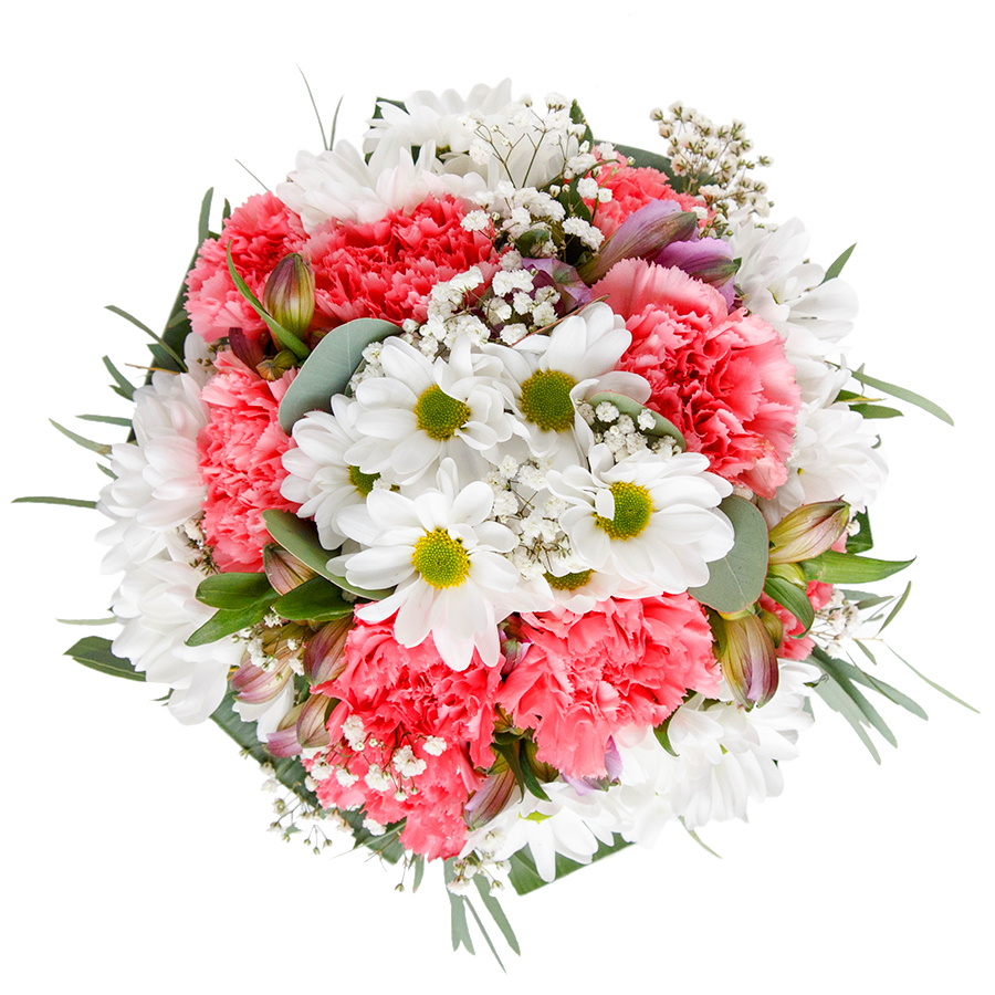 Enhance your moments with our exquisite white and pink flower ensemble. This beautiful arrangement includes snow-white chrysanthemums, airy gypsophila, lovely light pink carnations, and vibrant aspidistra leaves.