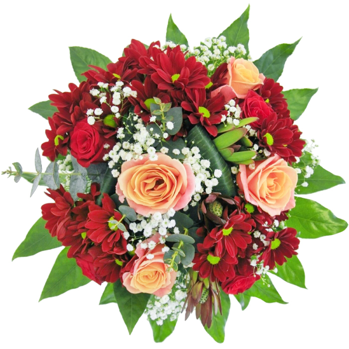 This magnificent arrangement boasts a glorious combination of sweet peach and scarlet roses, deep red spray chrysanthemums, white gypsophila, aralia leaves and eucalyptus leaves. Show someone how much you care stylishly.